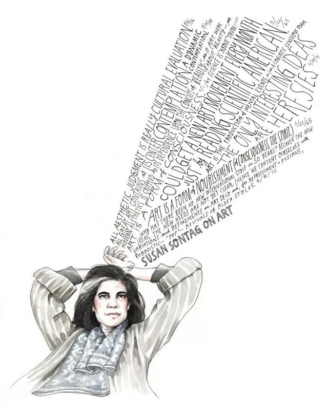 在她的筆記中,你可以不斷看到她自我神話的行為和努力,她堅持不懈地攝取各種生命的原材料,并把它們整合為一種觀念:自己是非比尋常的。當(dāng)然,每個人都這么做,但是桑塔格在做這件事的時候,比別人多了百萬倍的投入,強度也更大,因而也更加成功。她的神話無所不包,充滿誘惑。她的一個朋友評論道,她有一種“明星氣質(zhì)”,不是指她的美貌,而是指她尋求關(guān)注的欲望,以及對神話的自覺運用。她在日志中斥責(zé)自己:“不要有太多的微笑?!薄败浫跏且环N傳染病。強者理所當(dāng)然避開弱者?!弊盍钊藝@為觀止的是她想成為那種人的意志,她不斷地自我修煉,縫縫補補,仿佛這種意志是一篇文章。她二十四歲時寫道:“在這本日志里,我更加坦率地表達了自我,這一點在我表達任何其他人的時候是做不到的,但是不僅僅如此:我創(chuàng)造了我自己?!?/p>