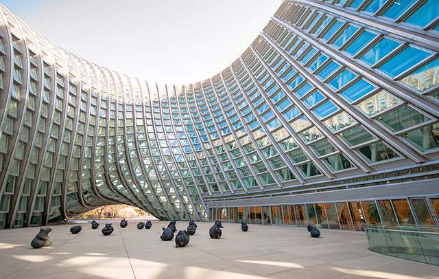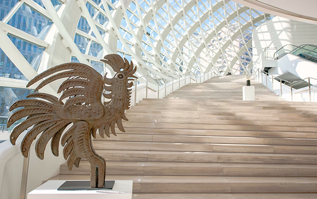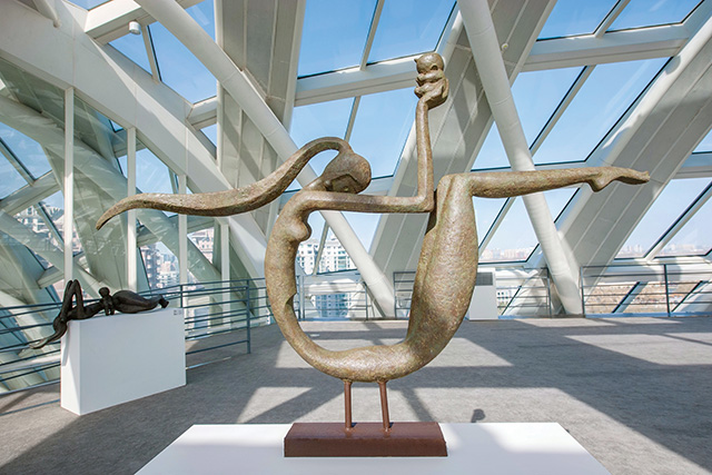 位于北京東三環(huán)附近的鳳凰中心擁有獨特的建筑風(fēng)格,其造型創(chuàng)意來源于莫比烏斯環(huán),空間與文化在拓撲的意義上被連接了起來,所形成的連續(xù)整體感與錯落交織的層次及環(huán)形結(jié)構(gòu),象征著鳳凰本身的特征屬性,展現(xiàn)包容與開放的藝術(shù)風(fēng)格。作為鳳凰衛(wèi)視2019年的年度大展,“美無止境——韓美林的雕塑世界”作品展在此舉辦,暗合著一段藝術(shù)精品與建筑佳作的奇妙緣分。主辦方表示,該展覽冀望以建筑的無限性來回應(yīng)韓美林藝術(shù)生命之永恒,詮釋了建筑、雕塑與心靈之間不可分割的因緣。通過這些作品的展示,當代藝術(shù)與現(xiàn)代建筑實現(xiàn)了完美融合,更加展現(xiàn)出強烈的視覺張力。二者的結(jié)合相映成輝,仿佛構(gòu)成了一幅穿越時空、超越地域、在交融中創(chuàng)造著無限未來的美妙畫作。