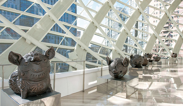 在此次的參展作品中,觀眾既可以看到韓美林在2015年為紀念世界反法西斯戰(zhàn)爭勝利70周年、聯(lián)合國成立70周年而特意創(chuàng)作的《和平守望》,也能欣賞到其曾于2008年被大英博物館收藏的青銅雕塑《馬》,還能欣賞到表現(xiàn)人文主義關(guān)懷的《母與子》系列、《豬》《熊貓》《熊》《馬》《牛》等動物系列,以及頗具實驗性的《人體》《天書》等十余個系列。其中,韓美林創(chuàng)作的形態(tài)各異、憨態(tài)可掬的小豬雕塑,曾于今年春節(jié)前后在故宮博物院舉辦的“韓美林生肖藝術(shù)大展”中亮相,吸引了海內(nèi)外大量觀眾前來參觀。