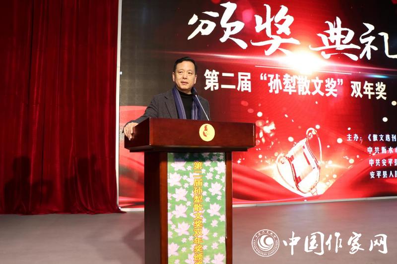 4月13日,第二屆“孫犁散文獎”雙年獎(2017-2018)頒獎典禮在河北省安平縣第二中學舉行。活動由散文選刊雜志社、中共衡水市委宣傳部、中共安平縣委、安平縣人民政府等單位共同主辦。中國作協(xié)副主席李敬澤出席頒獎典禮并致辭,中共安平縣委副書記、政府縣長范慶法致歡迎詞。衡水市人大主任王金剛,衡水市副市長崔海霞,何弘、鄧凱、劉家科、葛一敏、喬葉、馮杰等部分評委,當?shù)赜嘘P部門領導參加典禮并為獲獎作家頒獎。