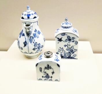 明清時期,中國商品大量進入西方,備受推崇,歐洲勁吹“中國風”,并深刻影響了歐洲等地區(qū)的陶瓷業(yè)發(fā)展進程,出現(xiàn)了既洋溢著中國風格又散發(fā)著異國情調(diào)的產(chǎn)品。德國著名的瓷器品牌“邁森”就是在這樣的背景下誕生的。18世紀初,因成功燒制出歐洲第一件瓷器而誕生的邁森瓷器廠,為迎合當時的國王奧古斯都對東方瓷器的癡迷,最初的產(chǎn)品以模仿清康雍乾時期的瓷器為主。拉脫維亞展廳里的一套青花茶具,就是邁森生產(chǎn)的,具有明顯的模仿痕跡。