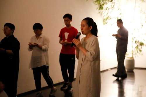 王瓊帶領(lǐng)嘉賓進(jìn)行“觀水經(jīng)行”時(shí),每個(gè)人手捧一只注滿水的茶杯緩慢行走,保持杯中水不外溢,暫時(shí)放下紛雜思緒,專注精神,感受自內(nèi)而外的平靜。