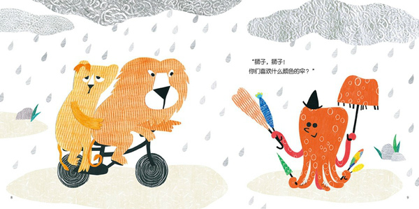 澎湃新聞:同樣采取這樣的創(chuàng)作手法,在《走出森林的小紅帽》里確實如王曉明先生所說比較有緊張感、粗糲感,完全不柔和,但是到了《章魚先生賣雨傘》里卻沒有這種感覺,顯得明艷活潑,這完全是因為內容造成的嗎?還是你在手法上有什么微調?