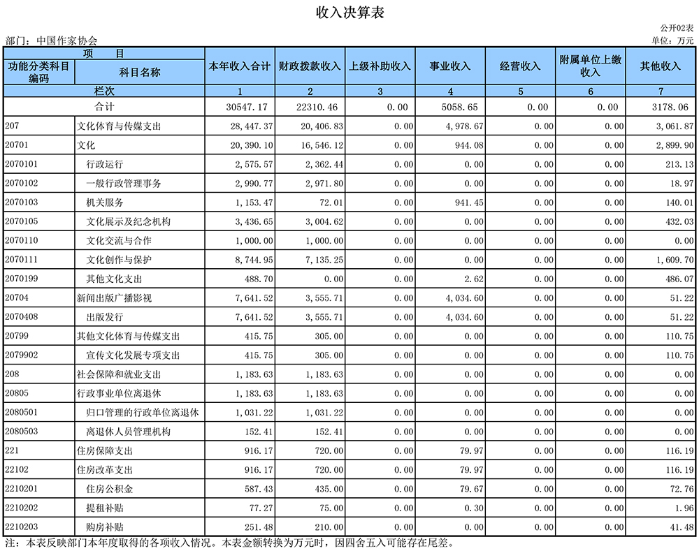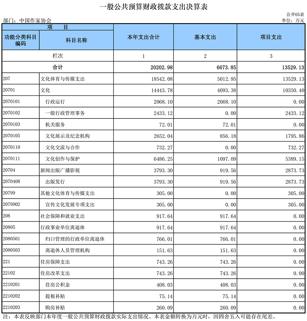 八、文化體育與傳媒(類)文化(款)一般行政管理事務(項):指中國作協(xié)本級組織作家深入生活等各項支出。