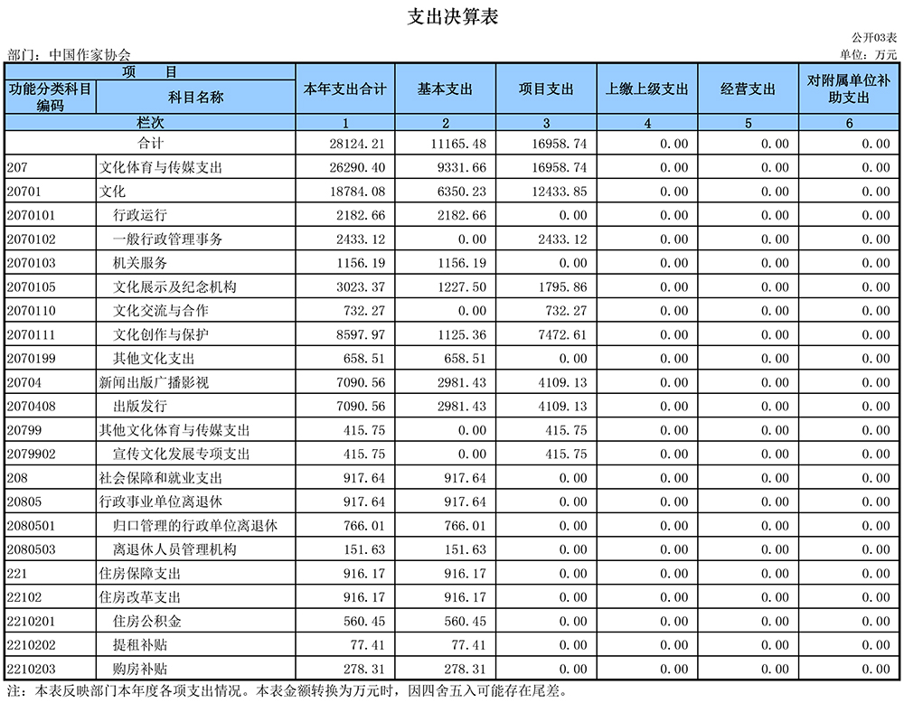 七、文化體育與傳媒(類)文化(款)行政運行(項):指中國作協(xié)本級行政人員工資及機構正常運轉、履行職責所需的基本支出。