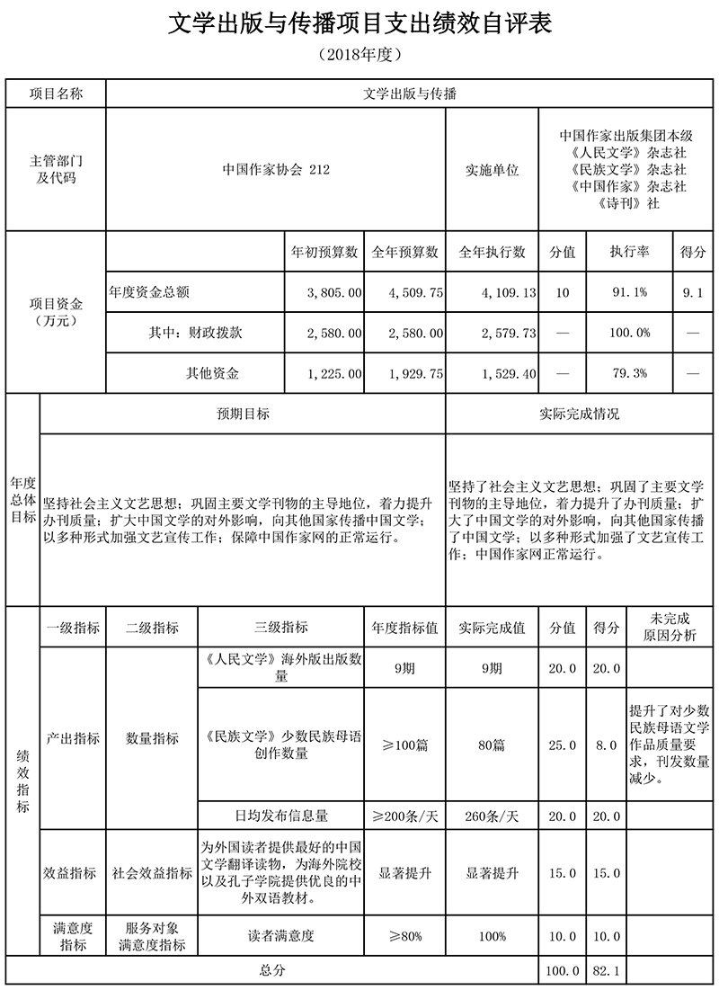 2.“文學出版與傳播項目”績效自評綜述:根據(jù)年初設定的績效目標,項目自評得分為82.1分。項目全年預算數(shù)4,509.75萬元,執(zhí)行數(shù)為4,109.13萬元,完成預算的91.1%。項目績效目標完成情況:堅持了社會主義文藝思想;鞏固了主要文學刊物的主導地位,著力提升了辦刊質(zhì)量;擴大了中國文學的對外影響,向其他國家傳播了中國文學;以多種形式加強了文藝宣傳工作;中國作家網(wǎng)正常運行。發(fā)現(xiàn)的主要問題及原因:一是部分績效指標設置不科學,不利于績效評價和實際工作的開展,執(zhí)行過程中完成難度較大;二是文學刊物的發(fā)行需要進一步提高。下一步改進措施:根據(jù)項目目標要求和實際工作開展情況,合理設置績效指標,著力突出文學刊物的受眾面和影響力。