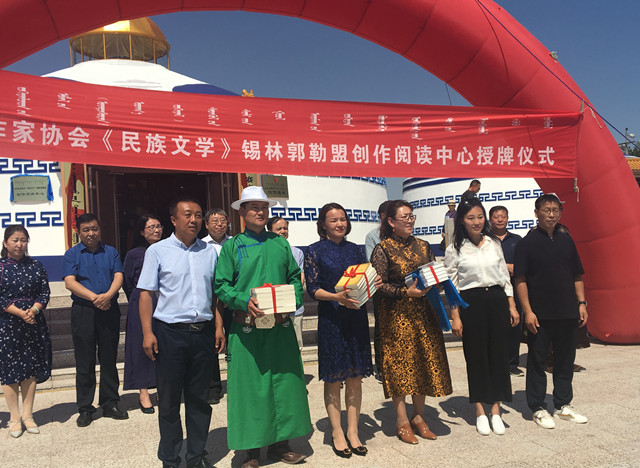 活動(dòng)期間,在納·賽音朝克圖紀(jì)念館舉行了《民族文學(xué)》錫林郭勒盟創(chuàng)作閱讀中心授牌儀式?!睹褡逦膶W(xué)》向錫林郭勒盟文聯(lián)和正藍(lán)旗文聯(lián)捐贈(zèng)由民族文學(xué)雜志社編輯的、分別由作家出版社和光明日?qǐng)?bào)出版社出版的《中蒙文學(xué)作品選集》和《〈民族文學(xué)〉精品選》。