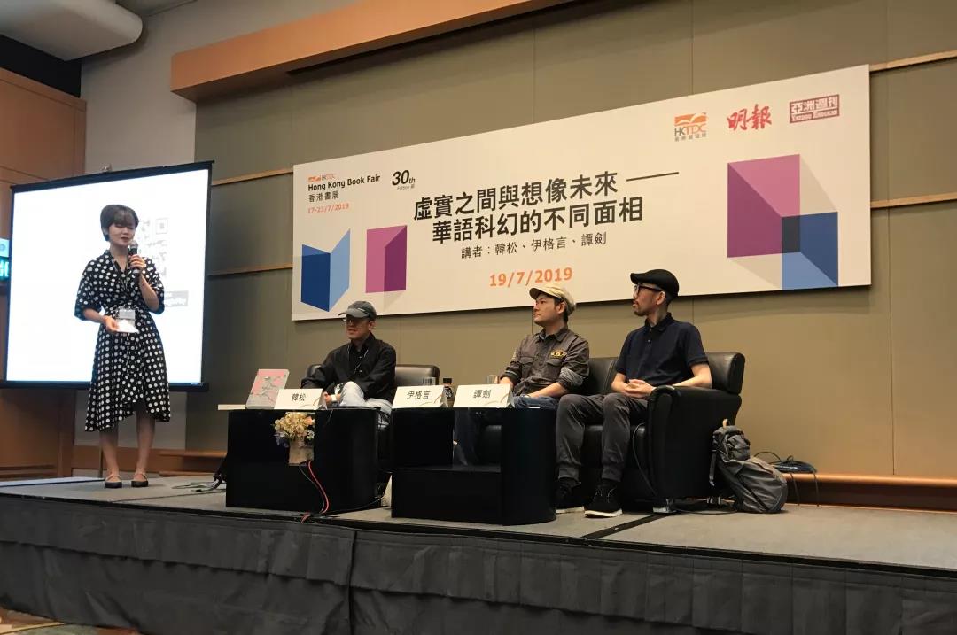 7月19日,韓松、伊格言、譚劍,兩岸三地三位科幻作家,以“虛實之間與想象未來——華語科幻的不同面相”為主題開展對話??苹靡舱墙衲甑谌畬孟愀蹠沟哪甓戎黝}。