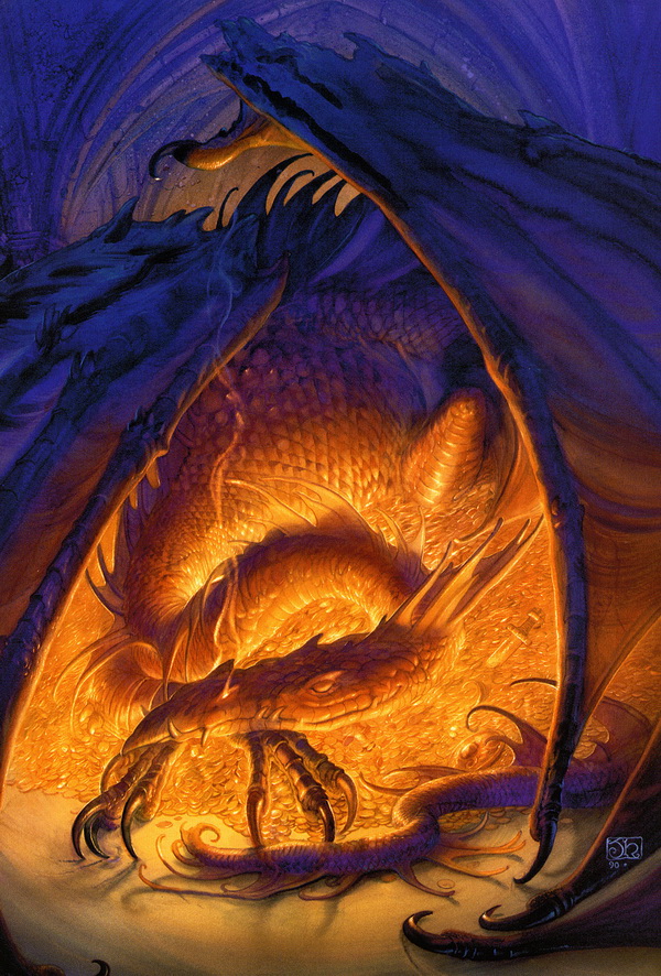 約翰·豪:舉兩個(gè)例子,一個(gè)是埃多拉斯金殿,托爾金確實(shí)有一兩筆是寫到了這個(gè)金色大廳長什么樣子,但是如果你看他寫的相關(guān)的文獻(xiàn)的話,你會(huì)知道他是受《貝奧武夫》)這樣一個(gè)經(jīng)典作品的啟發(fā)。所以作畫時(shí)我需要重新審視這個(gè)主題,就是要把這兩者:托爾金的描寫和《貝奧武夫》這個(gè)經(jīng)典作品中的描寫聯(lián)系在一起,使這些相關(guān)內(nèi)容也成為中洲世界的一部分。