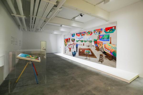 由日本建筑師青山周平主理設計的木木藝術(shù)社區(qū),隸屬于昔日老北京著名商圈隆福寺街 “再造計劃”的一部分。剛剛落成的木木美術(shù)館錢糧胡同館與周遭正在施工的工地,在地理區(qū)劃的分隔線上也并不明晰。嗅著揚塵與生灰的氣息步入展館,才發(fā)現(xiàn)這里實為從一處更具歷史年代感的職工食堂和地下人防工事改建而來。在展廳入口正中放置的是大衛(wèi)·霍克尼新近的作品《在工作室中》——在2017年結(jié)束之際,霍克尼將相機鏡頭轉(zhuǎn)向他的工作室,在這里有他最近的畫作、家具、畫架和三角架上的大書……