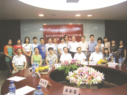 2010年9月復(fù)旦大學(xué)首屆MFA學(xué)生開學(xué)典禮,金炳華(左四)、王安憶(左二)、陳思和(右二)、虹影(右一)等作家、學(xué)者參加
