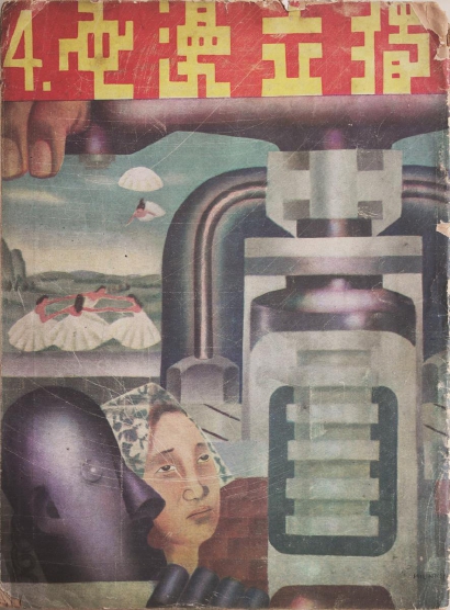 龐薰琹于1932年參加決瀾社第二屆展覽會的作品《構(gòu)圖》,以幾何化處理將七位人物貫穿并分布于畫面之間,其中中央位置的人物手持手風(fēng)琴,預(yù)示著某種音樂感與畫面構(gòu)圖的聯(lián)系,同時在相關(guān)造型處理上隱約地結(jié)合了某種立體主義的語言元素和特征。該幅作品以同名刊于“決瀾社第二回展覽會出品”的專欄中,發(fā)表于《時代畫報》第五卷第一期,上海時代圖書公司1933年11月1日出版。在1933年同年,龐氏類似《構(gòu)圖》畫面效果的另一幅作品,作為封面書衣作品,刊登于現(xiàn)代書局1933年8月發(fā)行的《現(xiàn)代》第三卷第四期中,形成了相關(guān)的視覺震撼與醒目的效果。