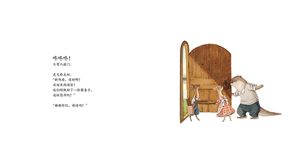 后來發(fā)現(xiàn)很多繪本都會用這樣的方式去敘述,包括約翰·伯尼罕的《和甘伯伯去游河》、葉夫格尼·M.拉喬夫的《手套》等,《水獺先生的新鄰居》作為畢業(yè)設計,當然要把我的學習成果展示一下,所以才有了繪本前面相似卻不同的構(gòu)圖、文字。