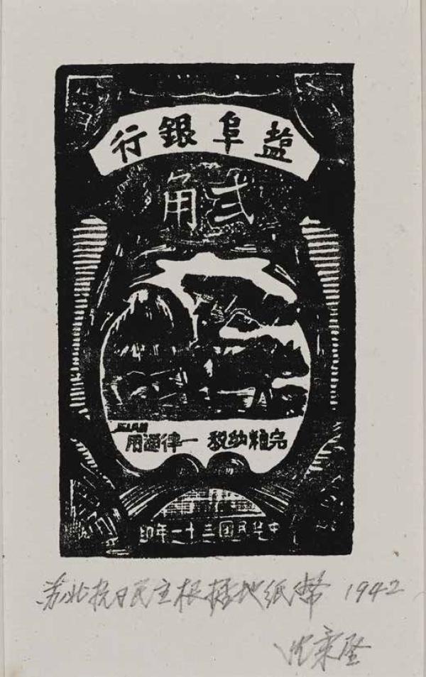 展開現(xiàn)場展出了沈柔堅在1942年創(chuàng)作的抗幣,沈柔堅在《以木刻畫作抗幣瑣記》中寫到,“1942年春,鹽阜區(qū)根據(jù)地開始建立鹽阜銀行時,需要發(fā)行貨幣,但苦于無制版條件。當時銀行行長駱耕漠同志托里程同志帶了封信到鹽阜報社找我,問我是否能用木刻圖案形式刻制鈔票,以便上機直接印刷。我說試試看,可用黃楊木。接此任務后,我便著手按大小票面設計畫稿。經(jīng)研究選定一橫一直各一種。駱耕漠同志看到后高興地說,真想不到木刻畫也可以做鈔票,用木刻畫印鈔票,風格刀法不同,別人很難假冒。我說,我只會刻畫不會刻字,用木刻刀刻字真費勁,‘1942年’的‘9’字刻反了怎么辦?重刻如何?銀行同志說,不要緊,這樣更假不了。我自己只保存拓印的一些原稿,原版便交給了銀行。不久鈔票正式印出并發(fā)行,我記得是用牛皮紙印成深藍色的,上面還蓋了銀行和行長的兩方朱紅色的小圖章,人們?yōu)樽约旱娜嗣裾状伟l(fā)行貨幣而喜悅,我看到木刻畫藝術在革命根據(jù)地能在各方面發(fā)行,感到格外高興?!?/p>