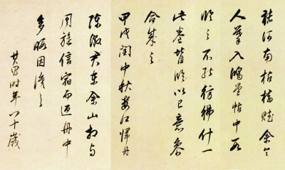釋文: 褚河南枯樹賦余令人摹入鴻堂帖中。數(shù)臨之,不能仿佛什一。此卷背臨,以己意參合成之。甲戌閏中秋,婁江歸舟,陳征君東畬山相與周旋信宿而返,舟中多暇因識(shí)之。其昌時(shí)年八十歲。