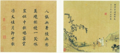 釋文: 霏微玉露灑秋晾,金粟攢枝點(diǎn)點(diǎn)黃。不用龍涎焚寶鴨,清芬暗襲綺羅裳。瓊臺(tái)高出萬花叢,袖拂天香散碧空。玉宇無云蟾窟朗,團(tuán)圓好景此宵同。