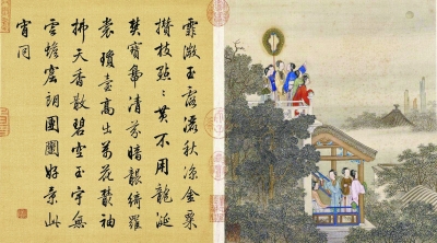 梁詩正書陳枚《月曼輕游圖》之款字,絹本設(shè)色,縱37厘米,橫31.8厘米,現(xiàn)藏北京故宮博物院。
