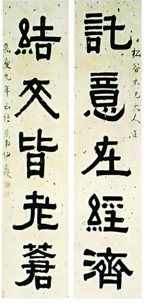 伊秉綬隸書源于漢隸,又有創(chuàng)新,古拙開張,融入顏體的挺拔、正直,變“蠶頭燕尾”、一波三折為沉著平直,收筆含蓄,筆法極簡,保留了篆書中段用筆,橫平豎直和帶弧度的撇捺,妙趣橫生。字形結(jié)構(gòu)方正飽滿,中宮疏朗,筆畫向四周開張。
