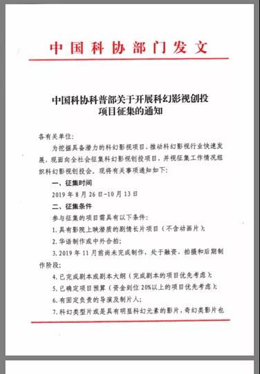 為了繁榮科幻影視創(chuàng)作、挖掘孵化具有市場潛力的科幻影視項(xiàng)目,2019中國科幻大會(huì)還特別設(shè)置科幻電影創(chuàng)投環(huán)節(jié),由中國科協(xié)科普部于8月28日正式公布了《關(guān)于開展科幻影視創(chuàng)投項(xiàng)目征集通知》。