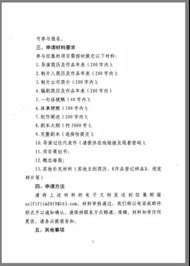 請將上述材料的電子文檔發(fā)送到征集郵箱scififilm2019@163.com,材料審核通過,我們將以電話或郵件形式予以通知確認(rèn)。請保持聯(lián)系方式暢通、準(zhǔn)確。材料如有任何更改,請務(wù)必提前告知。