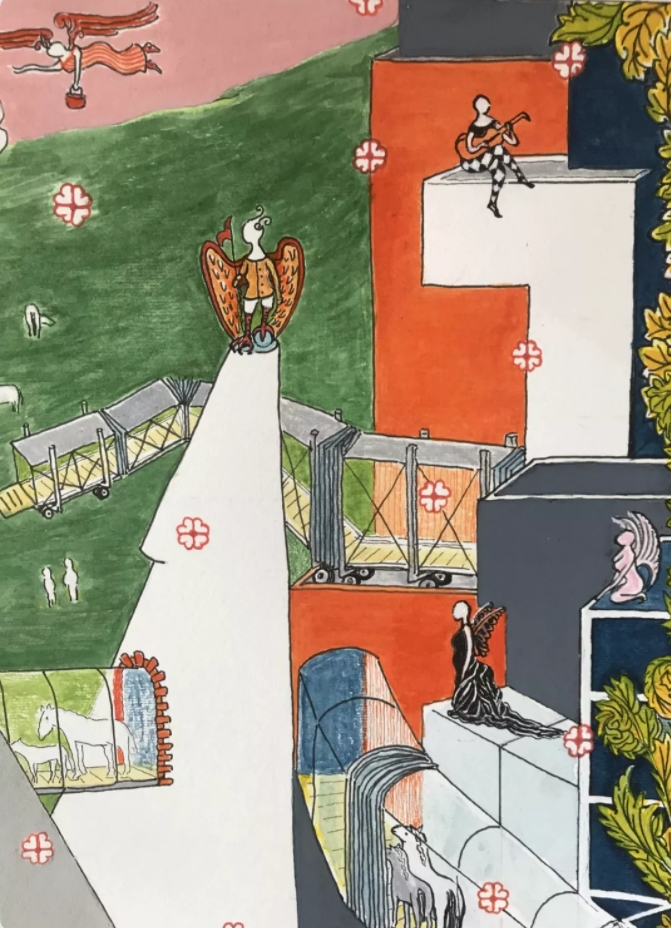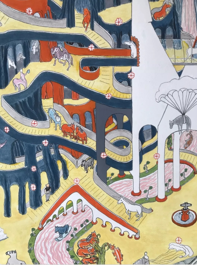 畫中不少形象,出自《山海經(jīng)》、西漢織物殘片及古墓、中世紀(jì)的壁畫。桃花,也就是我們打開微信“生日快樂”,紛紛揚(yáng)揚(yáng)落下來的那種效果,使現(xiàn)場變得更真實(shí)、更生動。