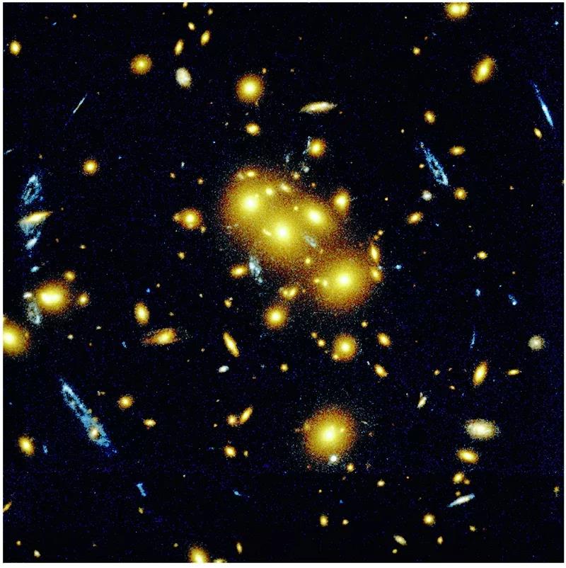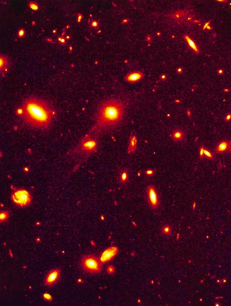 在宇宙的年齡只有現(xiàn)在的五分之三時,星系團是宇宙代表性的景觀。哈勃望遠鏡已經(jīng)在軌道上運行了22年,通過它的持續(xù)觀測,我們得到了星系團的影像。有些星系看上去互相處在對方的引力場里。這樣的相互作用在離我們較近的星系團中相當少見,說明宇宙確實在演化。