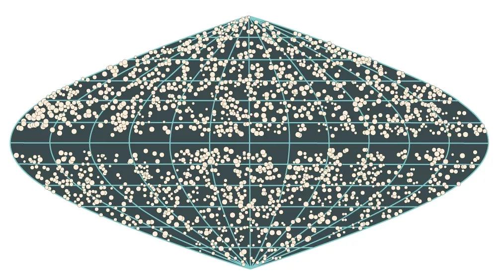 在這幅包含了從3億~10億光年遠的天體的圖中,可以明顯看出星系是均勻分布的。唯一不均勻的地方是靠近中線的間隙,那是因為天空的這個區(qū)域被銀河擋住了。這張圖片由普林斯頓大學的邁克爾·施特勞斯(Michael Strauss)依據(jù)紅外天文衛(wèi)星的數(shù)據(jù)制作。