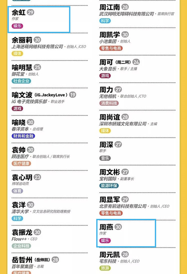 10月17日,福布斯中國(guó)公布了最新的30歲以下精英榜(30 Under 30),選出了600位30歲以下活躍在中國(guó)的創(chuàng)業(yè)和行業(yè)創(chuàng)新者。今年的青年精英有來(lái)自體育行業(yè)的女排主力袁心玥、馬術(shù)運(yùn)動(dòng)員華天,娛樂(lè)領(lǐng)域的陳飛宇、春夏等,以及眾多青年科學(xué)家和商業(yè)開(kāi)創(chuàng)者。令人驚喜的是,網(wǎng)絡(luò)文學(xué)領(lǐng)域中也首次有兩位作家榮登精英榜,分別為閱文集團(tuán)旗下白金作家余虹(筆名亂)和周燕(筆名囧囧有妖)。
