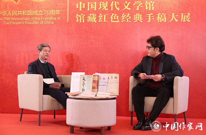 梁鴻鷹(左)介紹《文藝報(bào)》創(chuàng)刊背景