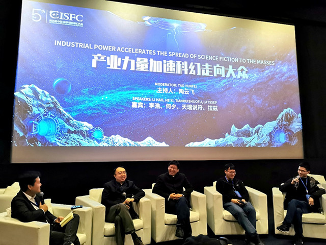 產(chǎn)業(yè)力量推動科幻文學走向大眾”分論壇現(xiàn)場 (左至右:閱文集團出版內(nèi)容部總監(jiān) 陶云飛、知名科幻作家 何夕、科幻世界雜志社副總編輯 拉茲、閱文集團科幻頻道資深編輯 李浩、閱文集團旗下作家 天瑞說符)