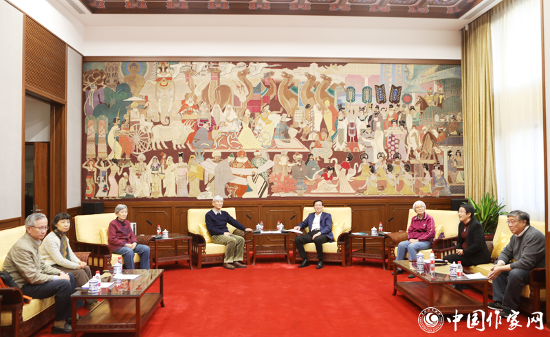 國家圖書館館長饒權(quán)(左二)與楊晦先生子女共同觀看楊晦先生手稿等珍貴文獻