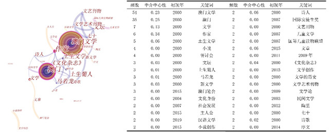 基于數(shù)據(jù)分析,“土生文學”、“土生葡人”是二十年澳門文學研究的高頻詞,《澳門文學源流與涵義之辨析》(張劍樺:《廣西師范大學學報(哲學社會科學版)》2009年第6期)中將澳門文學界定為一種“植入式文學”,認為其缺乏“根生性文學”元素。上述關鍵詞的出現(xiàn)論證了澳門的歷史性、地域性與跨文化性,其高頻次則證實了地域文化與文學書寫的關系成為澳門文學的基本的研究視角?!霸姼琛?、“詩人”及“小說”、“小說創(chuàng)作”提示著澳門文學的主流研究領域,尤其是詩歌,高中心度的數(shù)據(jù)揭示了詩歌在澳門文學體系中的主體地位。高頻詞“文藝刊物”、“文學藝術刊物”、“文化雜志”佐證了澳門文學副刊化現(xiàn)狀。澳門詩歌、散文的發(fā)表與傳播依賴文學雜志及文學副刊,因而媒介研究可成為澳門文化生態(tài)研究的另一個視角?!靶挛膶W”和“漢語文學”兩個關鍵詞反映出澳門文學已被納入“漢語新文學”研究視閾,《澳門文學與漢語文學的后現(xiàn)代感興》(朱壽桐:《社會科學輯刊》2019年第3期)與《澳門文學與漢語新文學的理論啟示》(朱壽桐《南方文壇》2019年第4期)闡述了澳門經(jīng)驗對于漢語新文學領域的獨特貢獻。