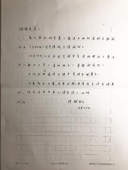 1992 年9月27日繆鉞致錢鴻瑛函復(fù)印件