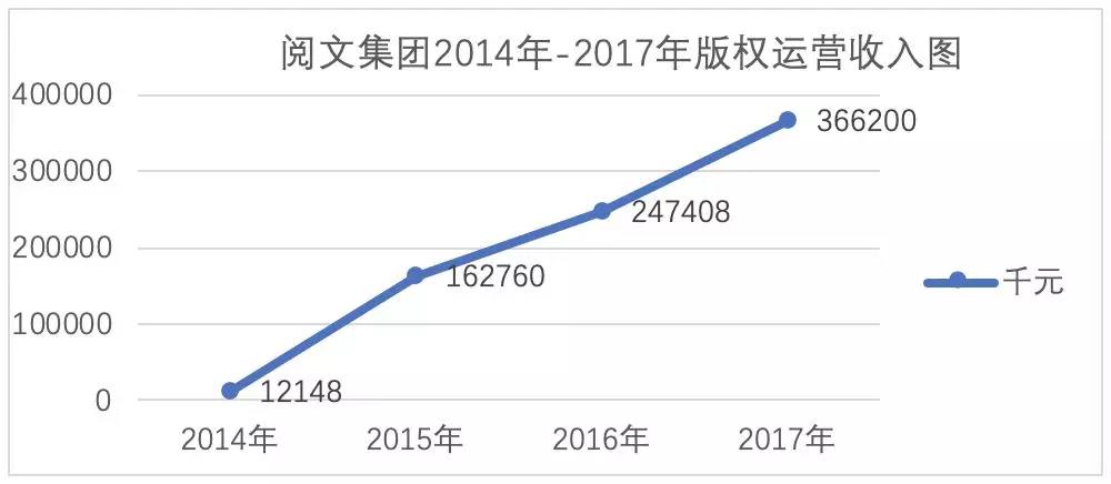 另外以閱文集團(tuán)為例,全版權(quán)運(yùn)營收入目前已經(jīng)成為其第二大收入來源。閱文集團(tuán)2014年到2017年的版權(quán)運(yùn)營收入呈現(xiàn)一個(gè)總體持續(xù)增長(zhǎng)的趨勢(shì),在2015年合并盛大文學(xué)之后,版權(quán)運(yùn)營年收入從1214萬元增長(zhǎng)到1.63億元,到2017年,達(dá)到3.66億元,出現(xiàn)了飛躍式增長(zhǎng)。