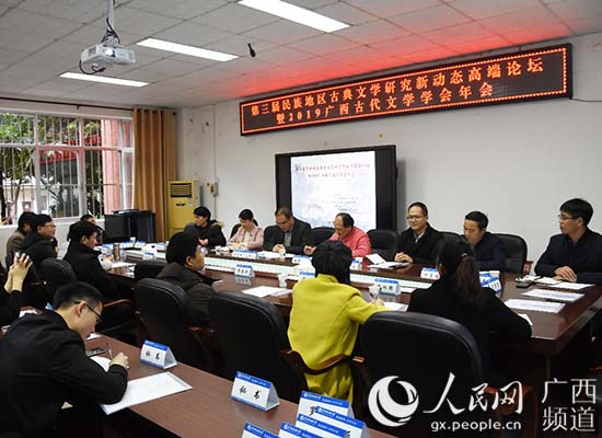 人民網(wǎng)南寧12月31日電 2019年12月21日,由廣西古代文學(xué)學(xué)會(huì)、廣西民族大學(xué)國學(xué)院主辦,廣西民族大學(xué)文學(xué)院協(xié)辦的“第三屆民族地區(qū)古典文學(xué)研究新動(dòng)態(tài)高端論壇暨2019廣西古代文學(xué)學(xué)會(huì)年會(huì)”在廣西民族大學(xué)逸夫?qū)嶒?yàn)樓舉行,來自廣西大學(xué)、廣西民族大學(xué)、南寧師范大學(xué)等區(qū)內(nèi)十余所高校、科研機(jī)構(gòu)的四十余名代表參加會(huì)議。