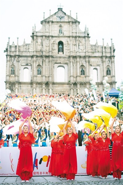 演員在澳門大三巴牌坊前進(jìn)行澳門國(guó)際青年舞蹈節(jié)巡游表演。新華社記者 張金加攝