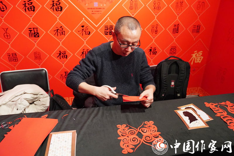 衡水剪紙協(xié)會副秘書長謝良雨先現(xiàn)場演示衡水民間剪紙藝術