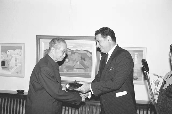 在希臘使館,羅念生接受雅典科學(xué)院最高文學(xué)藝術(shù)獎(jiǎng),大使發(fā)證書及獎(jiǎng)狀。