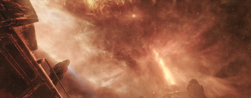 技術(shù)方面,因“地木相撞”而引發(fā)的諸如地震、冰原崩塌、巖漿滲入等災(zāi)難,更容易以電影特效的形式呈現(xiàn),也更能體現(xiàn)中國(guó)電影的技術(shù)水準(zhǔn)。例如,廢棄的城市地標(biāo)建筑在廣袤冰原上的崩塌,讓觀眾嘆為觀止,驚呼中國(guó)電影特效技術(shù)的進(jìn)步。除此,視覺(jué)呈現(xiàn)也可圈可點(diǎn)。地下城的展現(xiàn)布景考究、裝飾精致?;璋刀靵y的地下黑市,彰顯了危機(jī)下人類(lèi)生存環(huán)境的窘迫——科技雖然十分發(fā)達(dá),但生存環(huán)境反而倒退了。前半段,冰原崩塌時(shí),大片的雪白色場(chǎng)景渲染了末日的凄慘和悲情氛圍;后半段,“地木”即將相撞時(shí),改造發(fā)動(dòng)機(jī)過(guò)程中出現(xiàn)的暗黃色與木星爆炸時(shí)的暗紅色呈現(xiàn)得十分逼真,仿佛在襯托人類(lèi)文明的頑強(qiáng)。人類(lèi)的團(tuán)結(jié),可以在一片冰霜中點(diǎn)出希望的火種。遺憾的是,最后一場(chǎng)戲中的交叉剪輯并沒(méi)有營(yíng)造出“最后一分鐘營(yíng)救”的緊張感,反而弱化了情節(jié)的重點(diǎn)。
