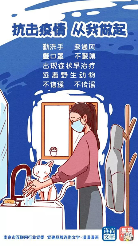 漫畫向全社會(huì)發(fā)出“抗擊疫情 從我做起”的倡議,呼吁大家“勤洗手,多通風(fēng),戴口罩,不聚集,出現(xiàn)癥狀早治療,遠(yuǎn)離野生動(dòng)物,不信謠,不傳謠”。