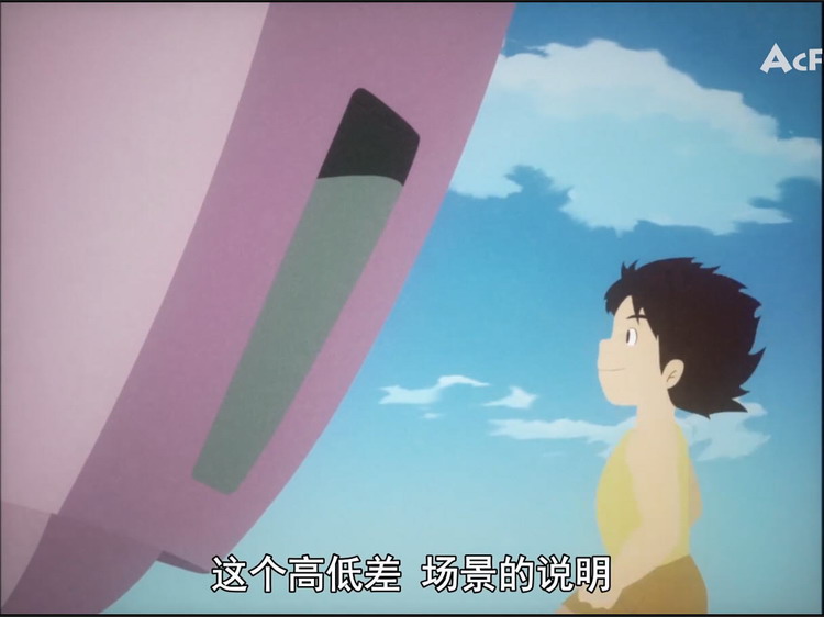 其次,要有技巧。同樣是在動(dòng)畫片的開始部分,湯淺政借著淺草綠之口對動(dòng)畫片《孤島的柯南》的細(xì)節(jié)大肆贊美。觀眾也由此得知,諸如高低對比、大小對比、用小物體反襯速度感等這樣的表現(xiàn)手法,對營造整部動(dòng)畫片的視覺沖擊力會(huì)產(chǎn)生怎么樣的奇妙效果。