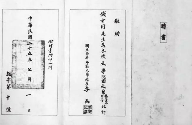 國(guó)立北平師范大學(xué)文學(xué)院國(guó)文系給錢(qián)玄同的聘書(shū)