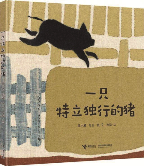 圖畫書《一只特立獨行的豬》則又是另一種“共生演化”,原文本是王小波的同名雜文,其文其意可能均非為兒童所能理解。但張寧對原著進行了視角轉(zhuǎn)換、抽離復(fù)雜時代背景、增添小豬成長細節(jié)和兒童見證者等一系列大刀闊斧的改編,從而實現(xiàn)了成人文學的兒童化。這種兒童化絕非幼稚化,因為原著中自由、自強和獨立的精神內(nèi)核被完整地保留了下來。為了表現(xiàn)原著內(nèi)蘊的精神力量,張寧采用“剪布法”并借鑒古樸的漢畫風格來鋪展故事。布藝拼貼畫面所呈現(xiàn)的強烈肌理質(zhì)感與質(zhì)樸、溫暖的氣息和原著所要傳遞的精神有著高度的匹配性。最終,這本圖畫書延展出文字的觸須所無法抵達的另一層表意空間,完成了一種智性精神的代際傳遞與演化。