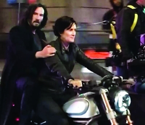 近日,該片正在美國舊金山拍攝動作戲,有網友拍到的幾段現(xiàn)場拍攝視頻曝光。當中凱莉扮演的崔妮蒂依然穿著經典的黑色皮革連身衣,騎著重機車在路上狂飆,基努·里維斯扮演的尼奧則坐在她身后。另一個片段是兩名演員在高空吊威亞演繹動作戲,看起來像崔妮蒂和尼奧的兩人,從大樓樓頂飛下來,場面相當驚險。