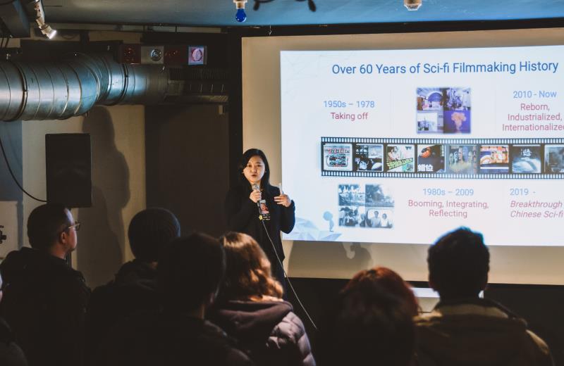 2月23日,一場名為“和‘藍星球’共同體驗科幻”的活動在柏林舉行,這是中國“藍星球科幻電影周”首次海外路演推介活動之一,吸引了大批德國科幻愛好者前來。圖為主辦方代表王薇在向來賓介紹中國科幻電影的發(fā)展歷程。