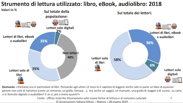 如果細(xì)分的話,2018年,在64%的閱讀人群中,如下圖左側(cè)餅狀圖,35%的人群只讀紙質(zhì)書,22%的人群既讀紙質(zhì)書也讀其它形式的書籍(此處意大利出版社協(xié)會(huì)似乎又犯了一個(gè)錯(cuò)誤,將22%寫成了35%;正式文件中小錯(cuò)誤頻頻,反映了意大利人的民族性格:“不拘小節(jié)”),即電子書與有聲書,還有3%的讀者只讀電子書與有聲書。下圖右側(cè)顯示,在所有讀者中,58%只讀紙質(zhì)書,36%為綜合型讀者,6%則為只讀電子書與有聲書的“電子化”讀者。