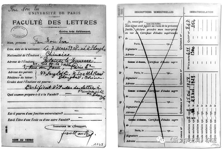 傅雷索邦大學(xué)文學(xué)院注冊卡(1928—1929年)