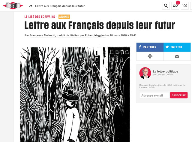 2020年3月18日,法國(guó)《解放報(bào)》刊登了一篇由意大利作家弗朗切斯卡?梅朗德里(Francesca Melandri)從過(guò)來(lái)人的角度寫(xiě)給法國(guó)人的一封信,從意大利語(yǔ)到法語(yǔ)的譯者為羅貝爾?馬齊奧里(Robert Maggiori)。復(fù)旦大學(xué)哲學(xué)學(xué)院教師王春明將法文翻譯成了中文,以供中國(guó)讀者共賞。