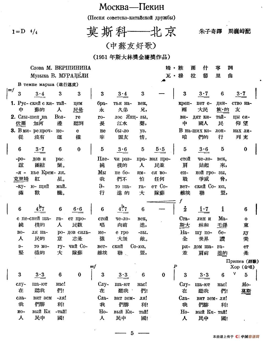 1950年2月9日晚,朱子奇將蘇聯(lián)詩(shī)人維爾什寧的著名詩(shī)篇《莫斯科——北京》譯為中文,很快流行全國(guó)。周恩來(lái)總理指示:“積極推廣,人人學(xué)唱。”蘇方對(duì)此歌很重視,詩(shī)與歌均獲1950年斯大林文藝獎(jiǎng)。