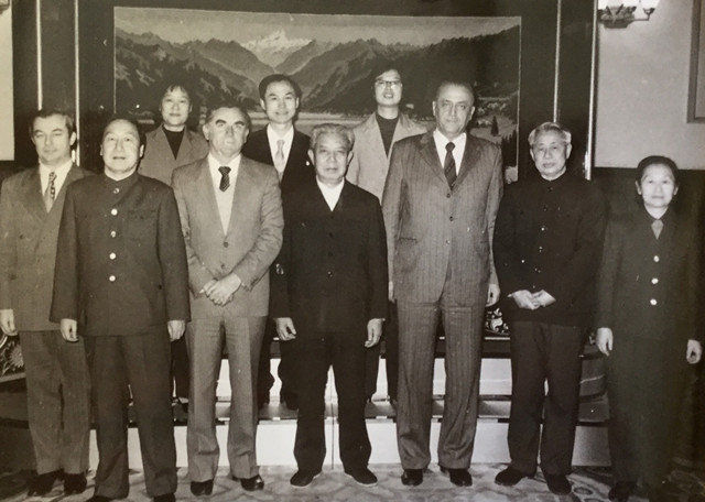 1978年4月中國(guó)人民對(duì)外友好協(xié)會(huì)代表團(tuán)訪問(wèn)羅馬尼亞,左二布楚里、左三團(tuán)長(zhǎng)王炳南、右一杜宣、右二梅益、二排右二為朱子奇。